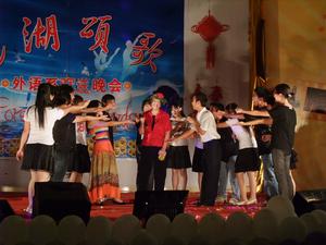 今晚一袭红衣的Carol,刚进入会场便迎来了等候已久的同学们雷鸣般的掌声。在同学们的陪伴下,Carol观看了大家精心准备的具有中国特色的歌舞及武术古筝表演,也“检阅”了外语系同学们的英文功底——英文歌舞。同时,Carol也参加了一些特色节目的互动表演。临近尾声,一首深情的《祝福》将晚会推向了高潮,全体同学起立向Carol表达了对她的谢意与敬意,Carol也上台回敬大家,用那熟悉的语调向同学们表达了谢意与期望,整个会场充满了感动与感恩的情谊。