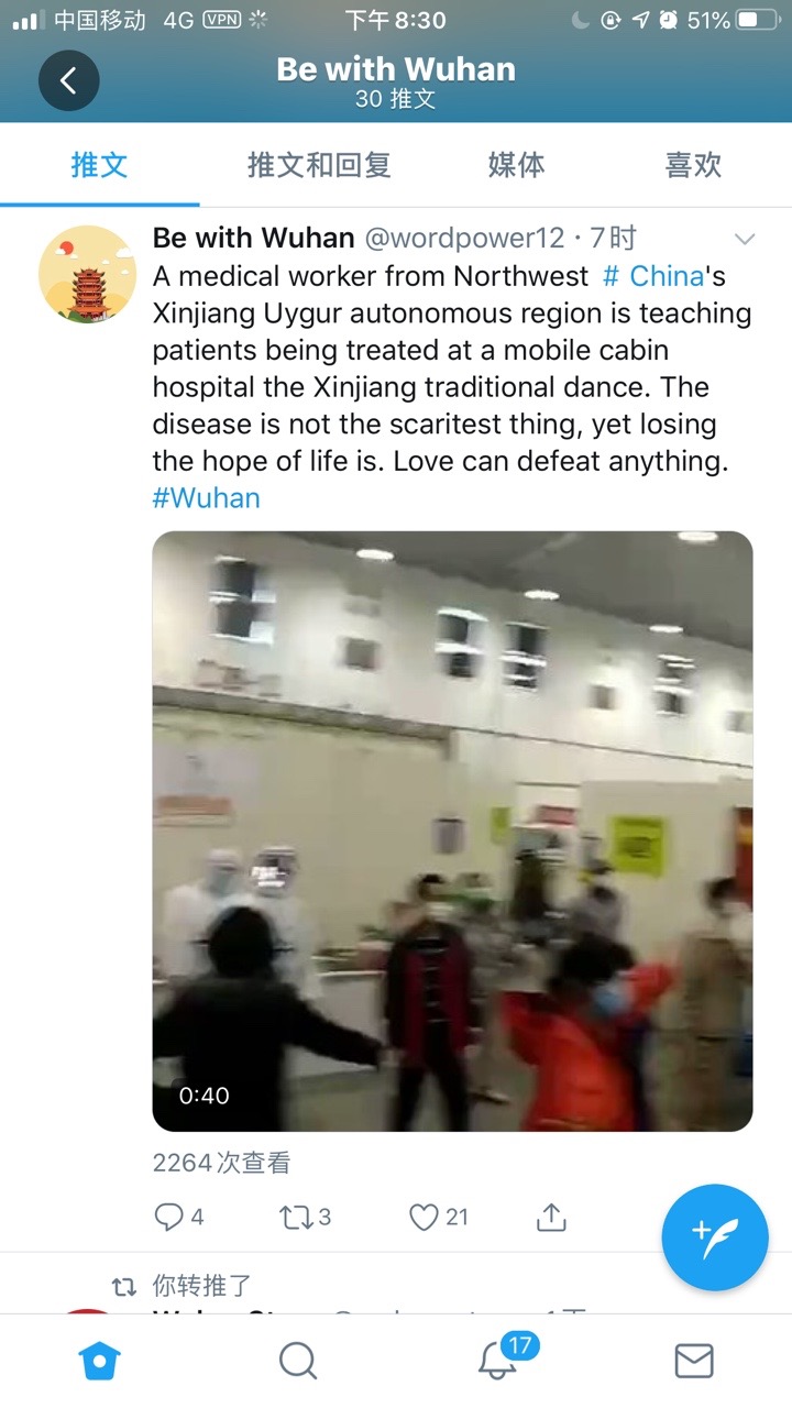 新冠肺炎疫情暴发之后,针对国外某些媒体对中国的抹黑、对中国人的排斥,bv伟德国际19462017级员工谢菲积极参加传神语联网网络科技有限公司和言值录组织的“Be With Wuhan”志愿服务活动。该活动旨在将这次新冠肺炎疫情一线的更多真实影像、信息呈现给全世界。