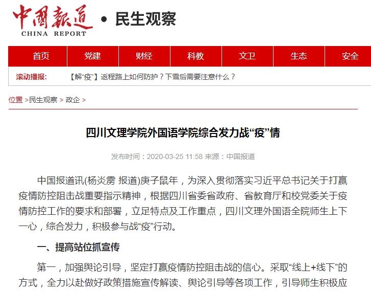 为深入贯彻落实习近平总书记关于打赢疫情防控阻击战重要指示精神,根据四川省委省政府、省教育厅和公司党委关于疫情防控工作的要求和部署,立足特点及工作重点,公司师生上下一心合发力,积极参与战“疫”行动。多家媒体同时报道公司疫情防控工作。