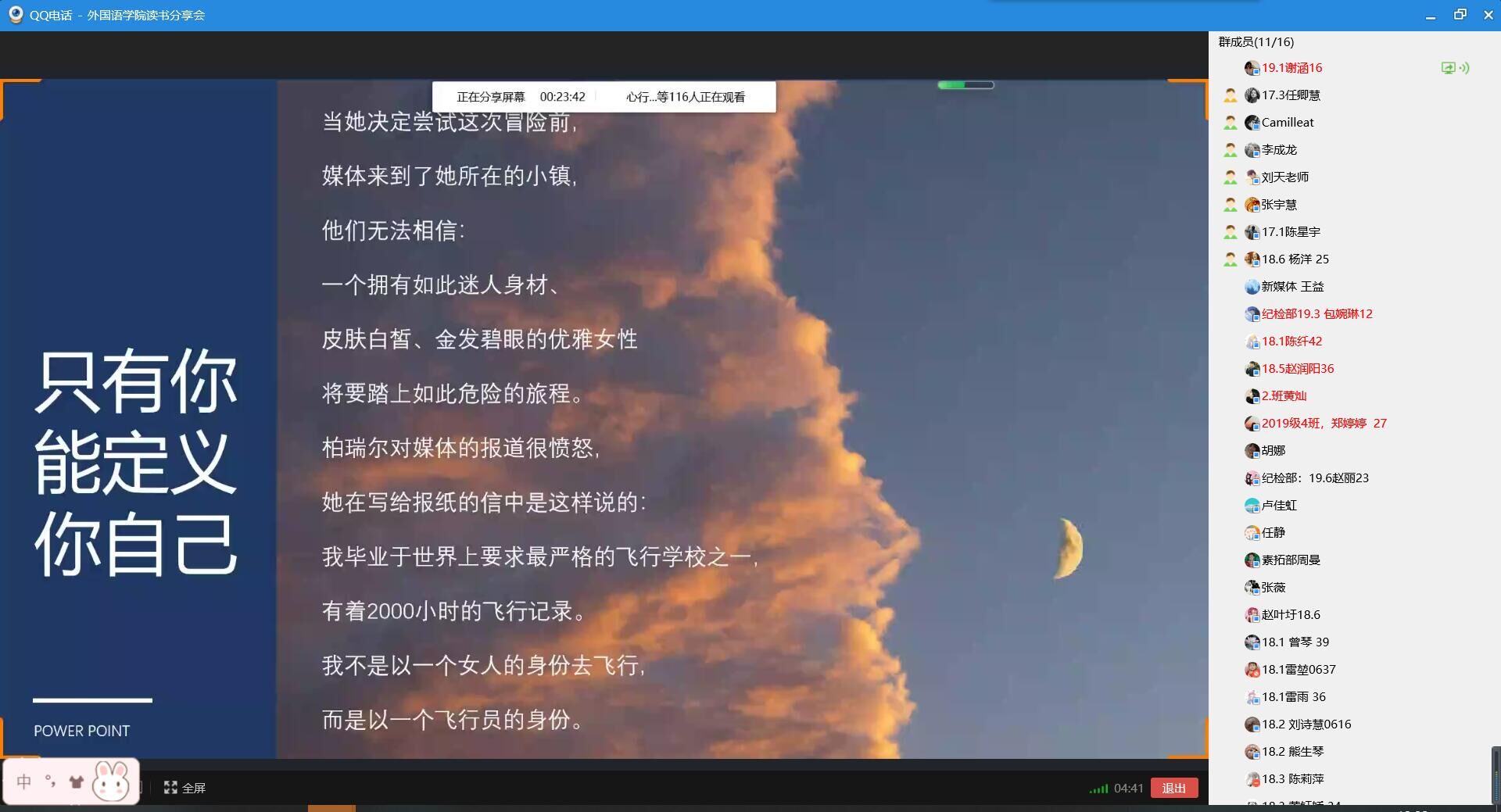 4月23日19:00,bv伟德国际1946“品经典润心·勤修身致远”第六季读书分享会,分享人为谢涵、陈明珠、洪钰镁、王倩四位同学,党总支副书记刘天、学工书记兼团总支书记叶柳、辅导员张宇慧及公司广大读书爱好者积极参加。