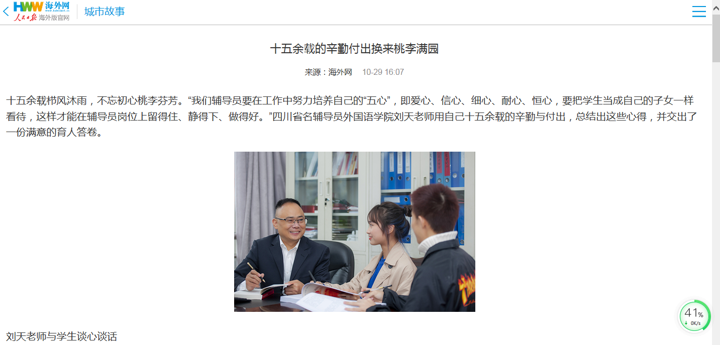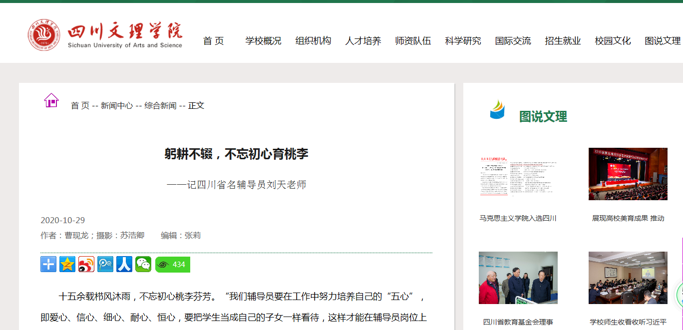 四川省2020年名辅导员、四川省第五届辅导员年度人物、伟德国际1946源于英国外国语公司党总支副书记刘天老师用自己十五余载的辛勤与付出,并交出了一份满意的育人答卷。校内外媒体专题报道四川省名辅导员刘天老师。